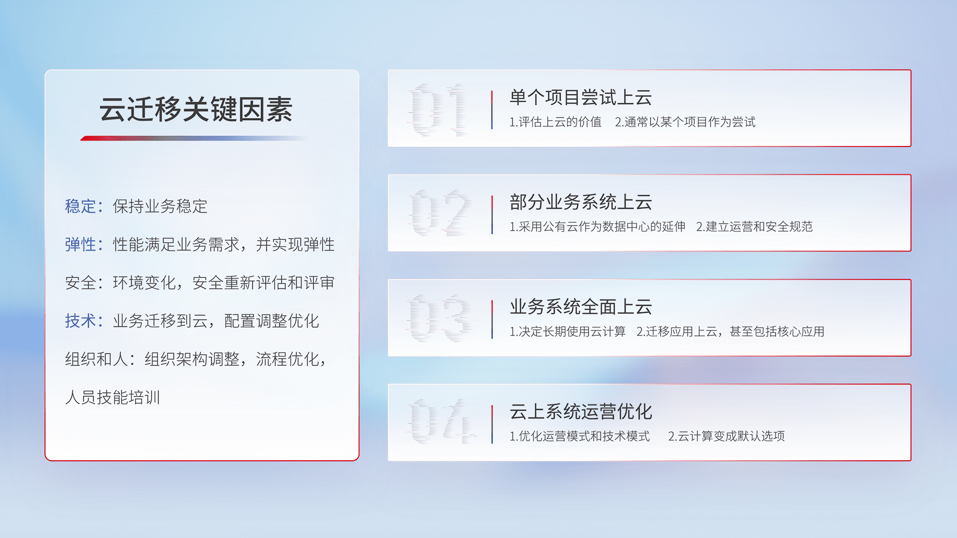 结合实际业务,,,,从规划设计、、云平台选型、、、、云原生改造、、、、数据迁移、、集成交付,,,,迁移全过程为客户识别最佳上云路径,,做好风险识别管理,,,,设计网络架构、、身份权限、、、安全审计合规、、操作审计、、日志审计、、监控告警策略、、、、多站点容灾设计等,,,对云上基础设施进行整体规划,,提升IT治理水平,,,,以满足弹性、、、高可用、、、高性能的需求。。